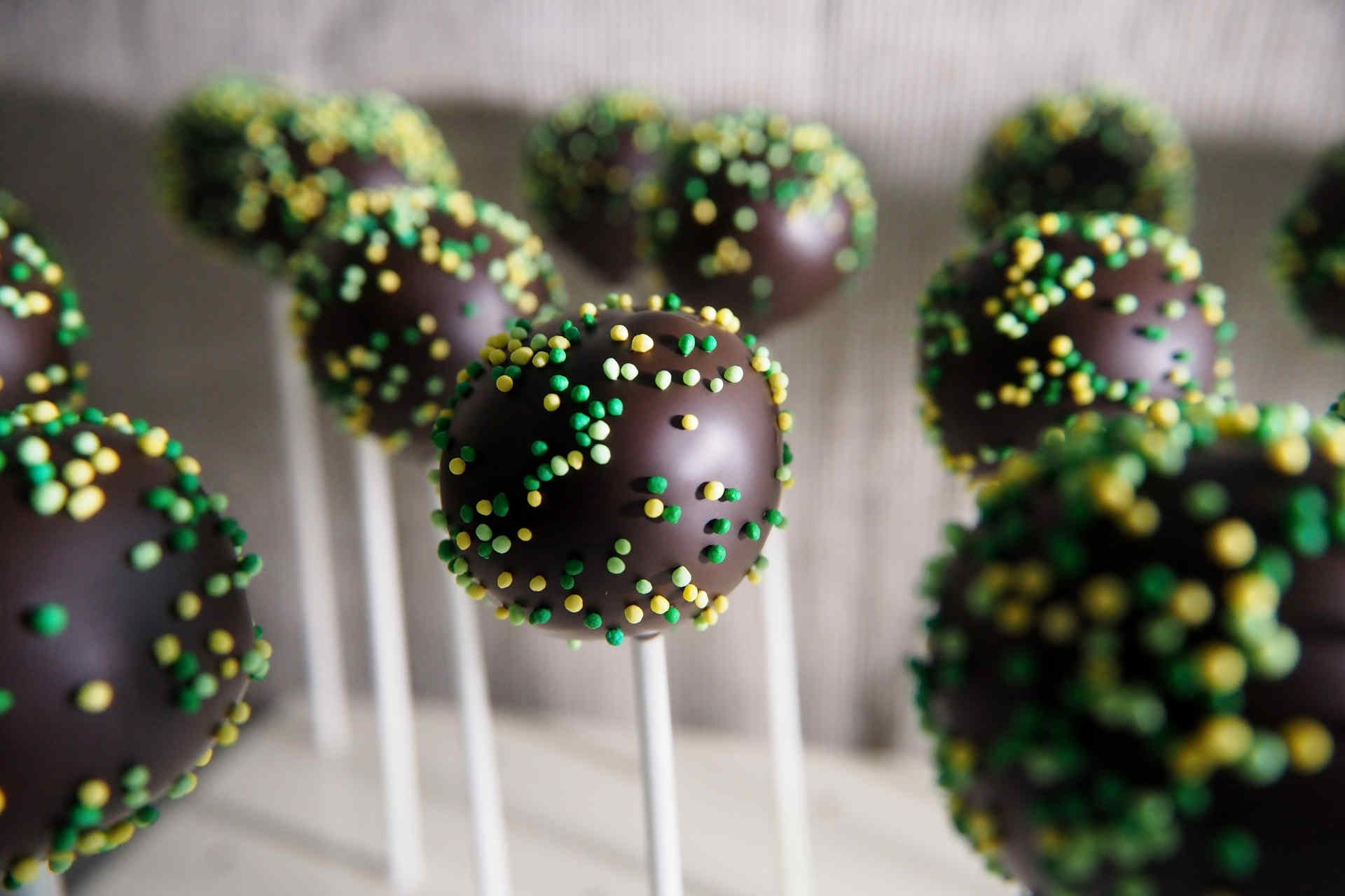 Dip each lollipop stick about 1 cm deep into the melted chocolate and then insert it into a ball. Wait briefly until the chocolate sets – this will help the stick stick better.